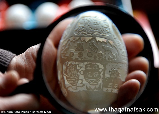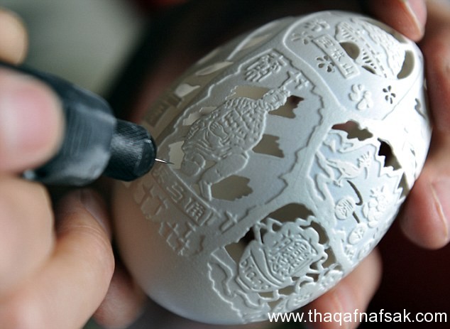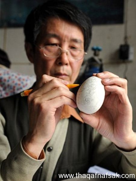 برع الفنان الصينى Wen Fulyan في فن غريب من نوعه و هو رسم لوحات كاملة و نحتها على قشر البيض بشكل يثير الدهشة ، يعيش Wen في مقاطعة شاكسى Shaanxi ،في السابق كان يعمل في النحت على الأخشاب لكنه ترك ذلك و كرّس كل وقته لهذا الفن الغريب و يمارس هذا الفن منذ 10 سنوات ،فى البداية كان يفل ذلك كهوايه ثم اتخذها كحرفة لكسب المال ،يستخدم Wen بيض الدجاج ،الأوز و البط للوصول لهذه الأعمال المدهشة .